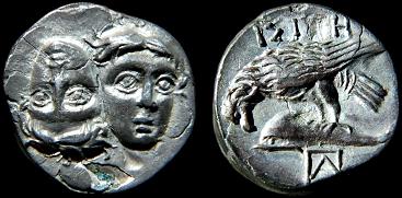Istros. 400-350 BC. AR Stater. 18mm, 5.09g. Obv: Two male head facing side by side, one inverted. Rev: IΣTPIH, sea eagle, dolphin, ΓA. Ref: Sear(GC) 1669