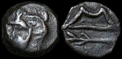 Phanagoreia. 400 BC AR Diobol 11mm, 1.56g. Obv: Head of young Kabeiros in a conical cap left Rev: ΦA bull left, grain to the right Ref: Anokhin (Bosporus 1986) 78